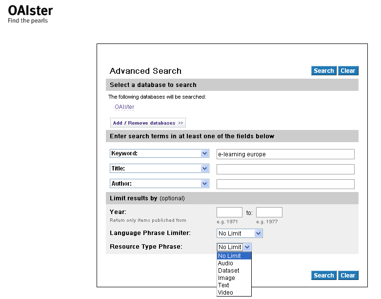 Arhiivimaterjalides otsimiseks on eraldi otsinguvorm, mis võimaldab otsida ainult OAIsteri materjalide hulgast http://oaister.worldcat.org/advancedsearch .