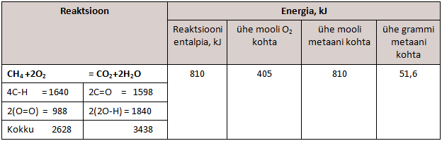 Maagaasi peamise komponendi metaani põlemisel eralduva energia leidmiseks tuleb kõigepealt arvestada sidemeenergiaid (tabel 2).