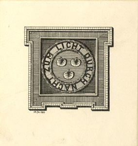 Nelinurkses raamistuses sõõr ja sõõris kolm puulehte. Joonises all vasakul signeering: HK fec. 1909. ümber sõõri deviis: DURCH NACHT ZUM LICHT