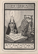 Nelinurkses raamistuses öökull avatud raamatul, vasakul surnupealuuga küünlajalg ja põlev küünal. Joonises all paremal signeering: AC all: А.П. САНДУЛЕНКО. ülal keskel: EX LİBRİS keskel avatud raamatus: Ad veri- / tatem per / scientiam;"Иваск