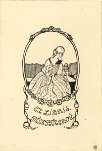 Ovaalses raamistuses naisefiguur raamatut lugemas, tagaplaanil paistab pargimaastik rotundiga. Joonises all keskel: EX LIBRIS / Т. СЕРГѢЕВОЙ;"Иваск