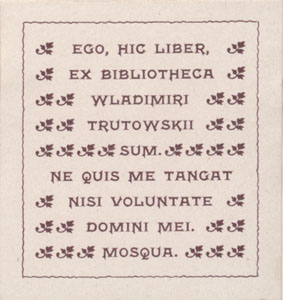 Nelinurkses raamistuses lilledest ornament. Joonises keskel: EGO, HIC LIBER, / EX BIBLIOTHECA / WLADIMIRI / TRUTOWSKII / SUM. / NE QUIS ME TANGAT / NISI VOLUNTATE / DOMINI MEI. / MOSQUA.