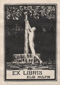Nelinurksel mustal taustal üles sirutatud kätega meesakt purskkaevu juures. Joonises all paremal signeering: MS all: EX LIBRIS / ELIS HULTIN