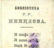 Lehel tekst: БИБЛIОТЕКИ / Р. Р. / МИНЦЛОВА / № шкафа / № полки / Общiй №