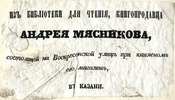 Lehel tekst: ИЗЪ БИБЛIОТЕКИ ДЛЯ ЧТЕНIЯ, КНИГОПРОДАВЦА / АНДРЕЯ МЯСНИКОВА, / состоящей на Воскресенской улицъ при книжномъ / его магазинѣ, / ВЪ КАЗАНИ.