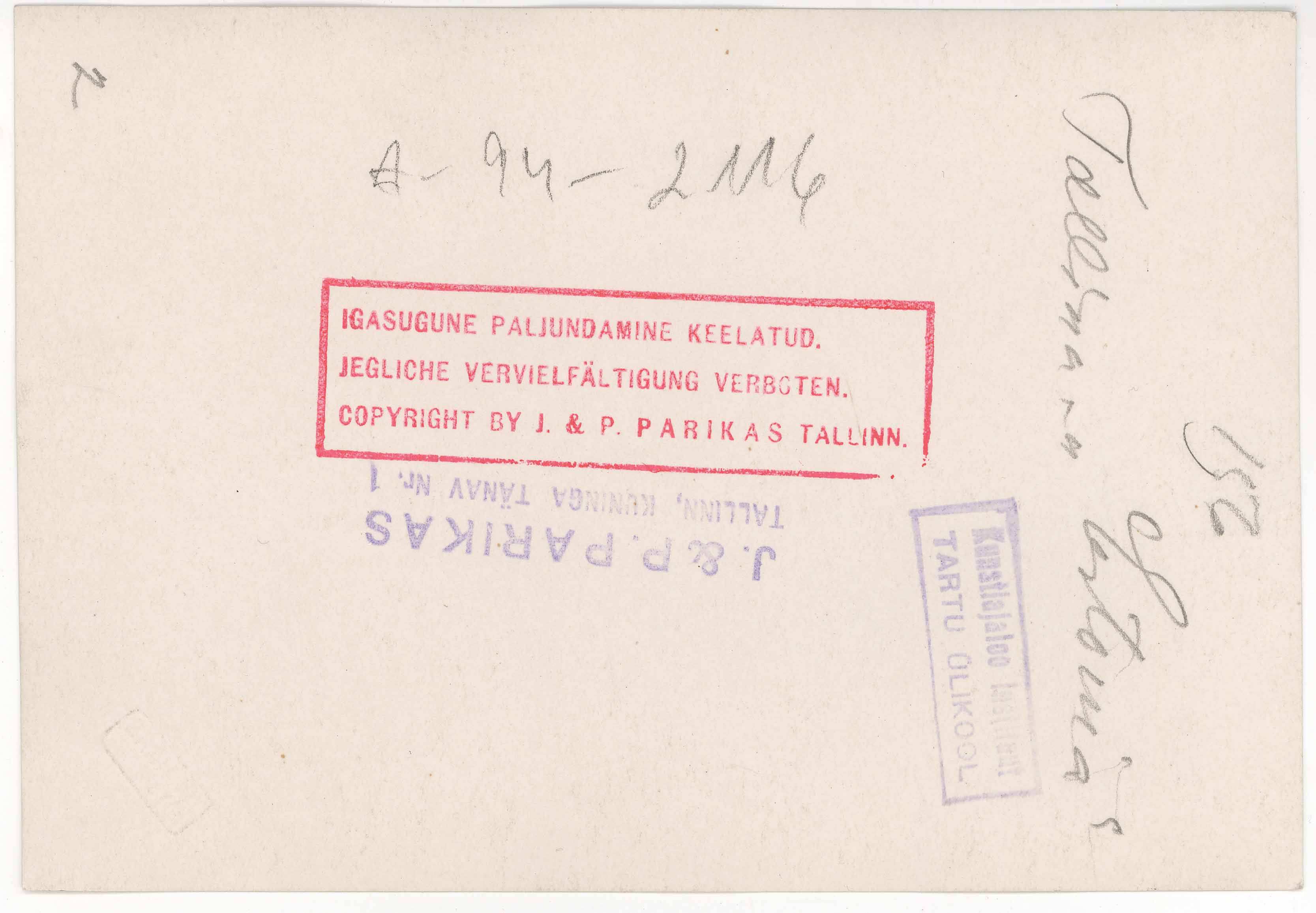 Tekst foto tagaküljel: 156 Tallinn "Estonia". Templid: Parikas; Instituut
