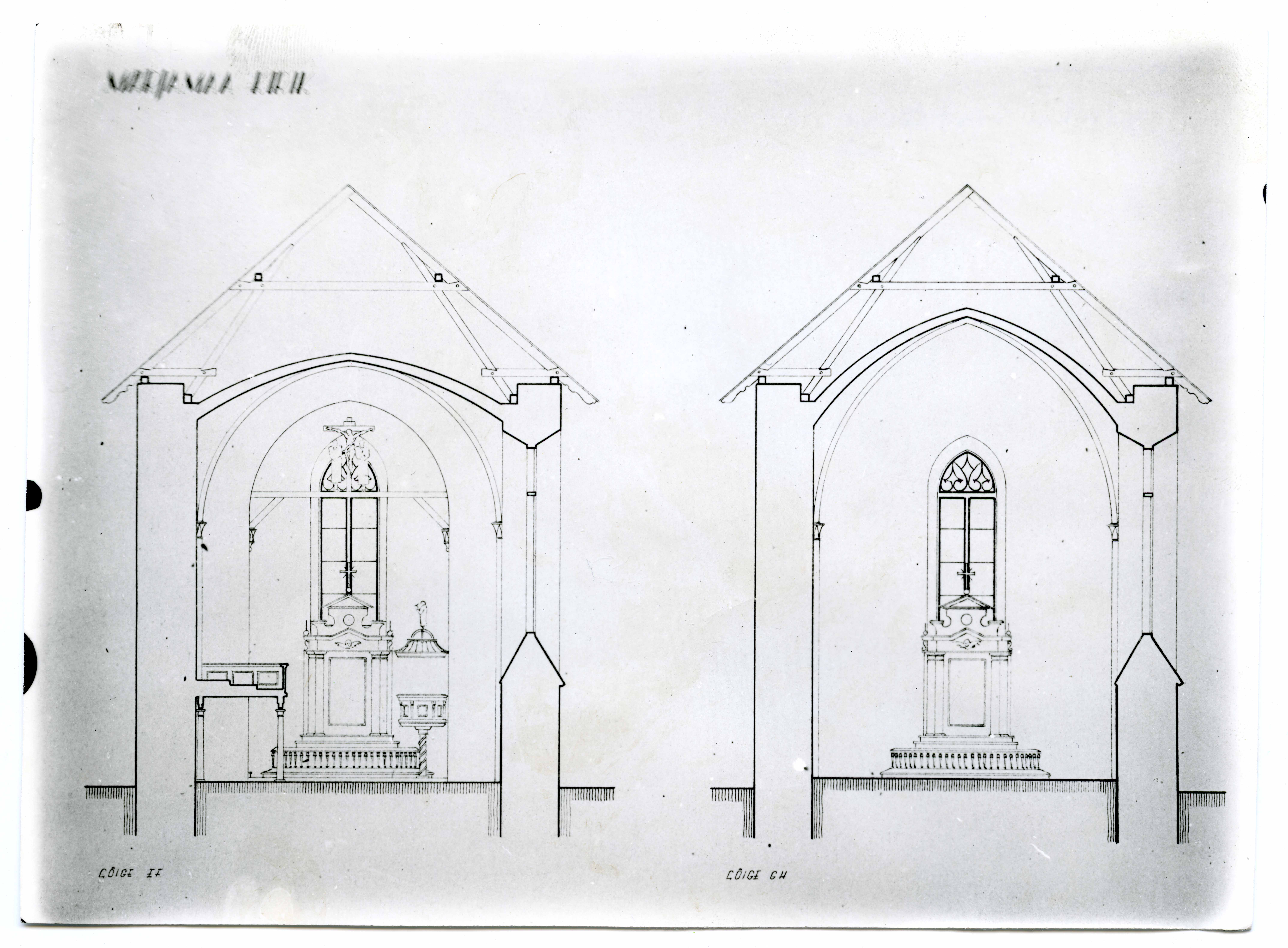 Märjamaa Maarja kirik. Pikihoone ja koori ristlõiked. Koostanud O. Grohmann 1938.a.