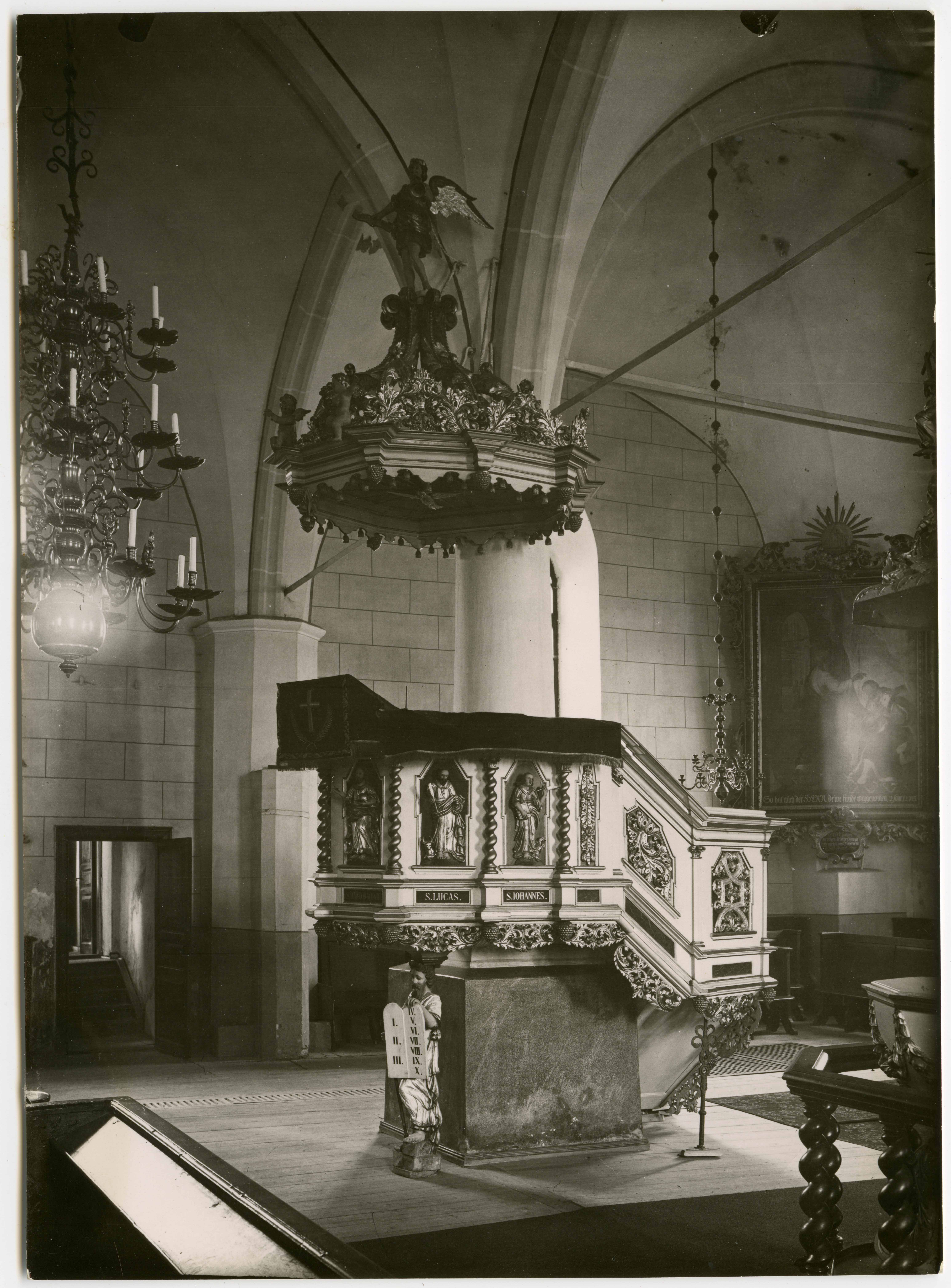 Narva. Saksa Luteriusu Jaani kirik. Kantsel, Johann Valentin Rabe, 1734. Tagaplaanil koorisuumis maal