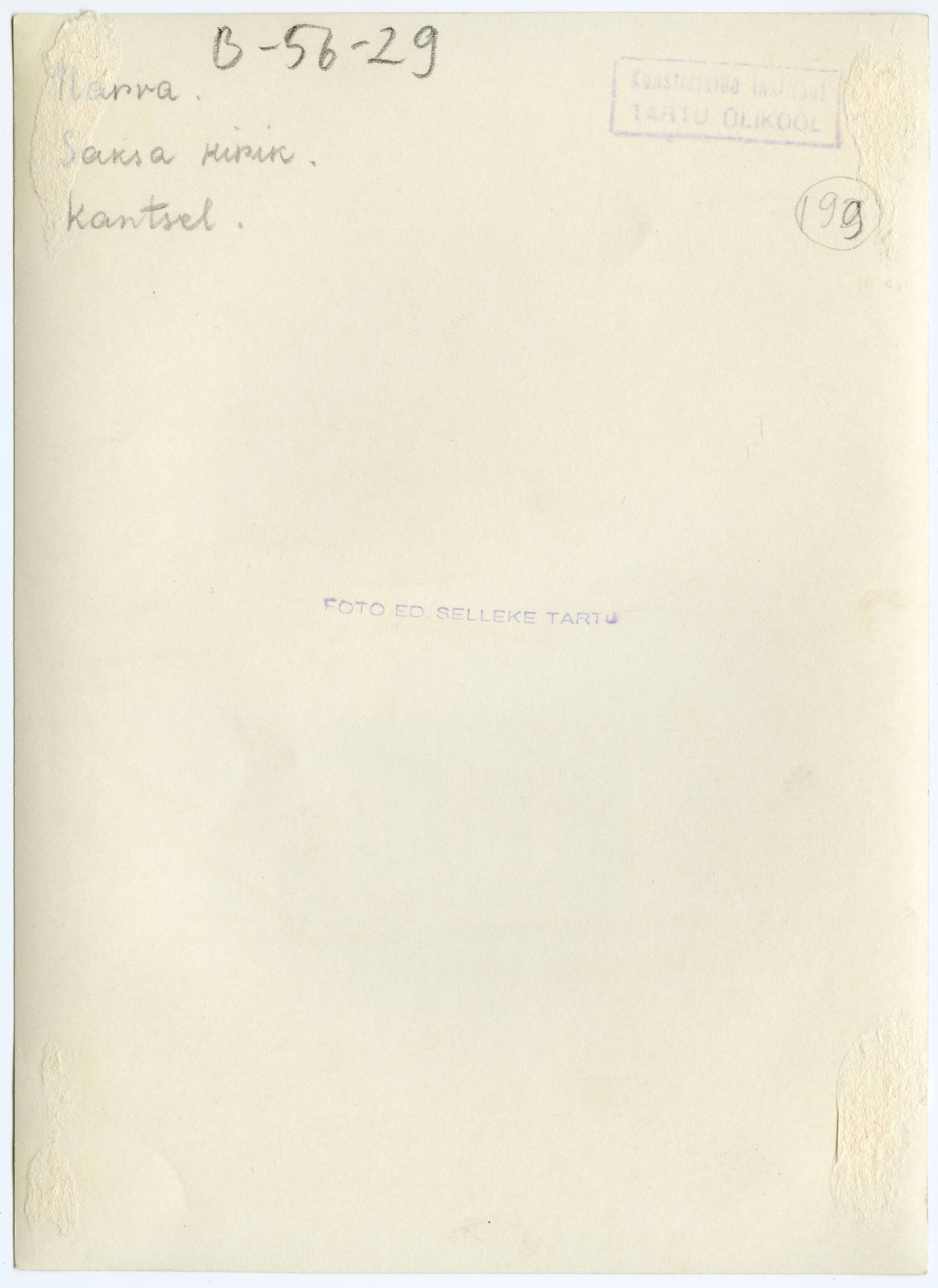 Tekst negatiivi ümbrikul: Narva. Saksa kirik, kantsel. N:N.III.4. (Johann Valentin Rabe, 1734). Tempel: Selleke