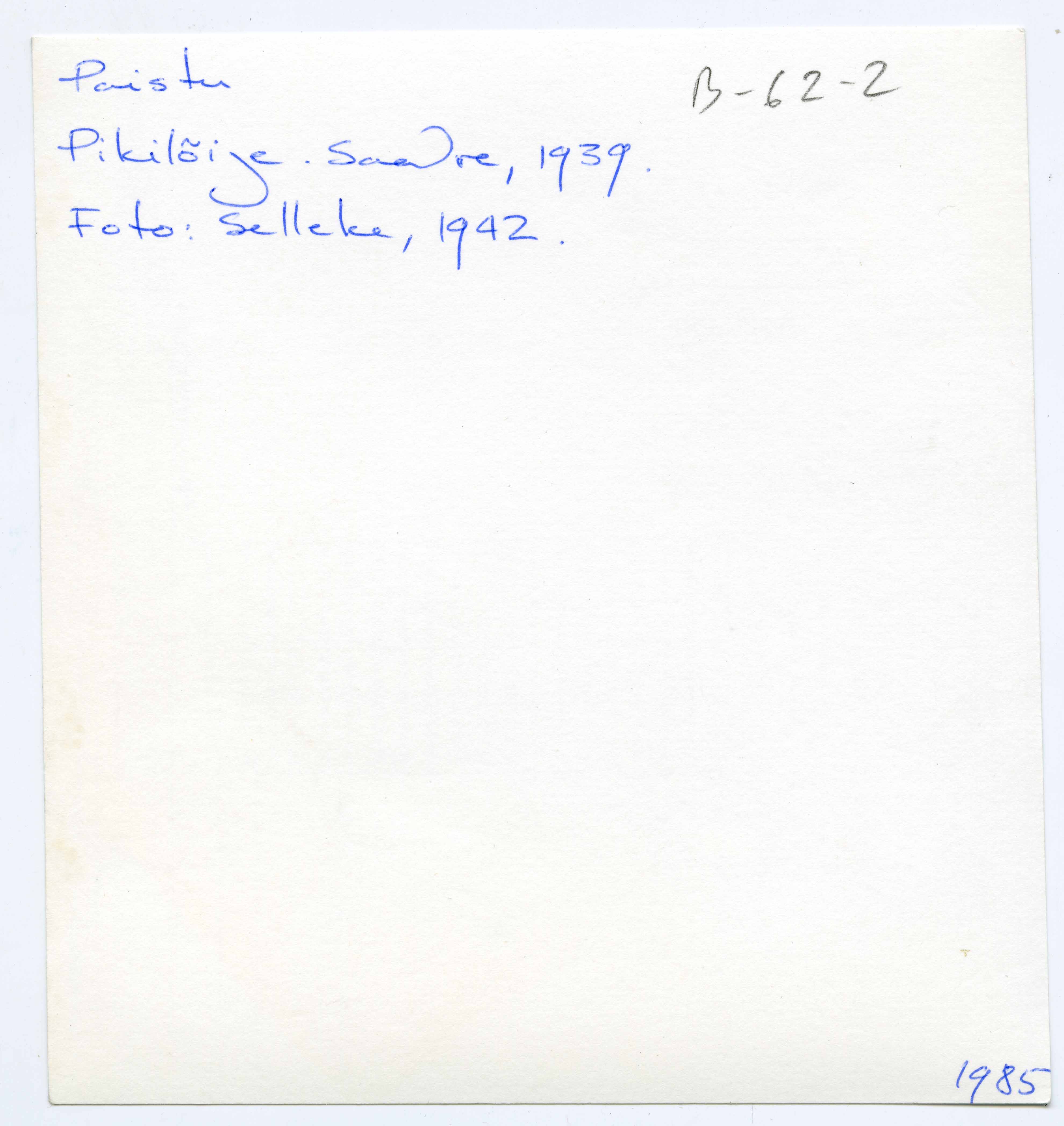 Tekst foto tagaküljel: Paistu. Pikilõige. Saadre, 1939. Foto: Selleke, 1942 (1985)