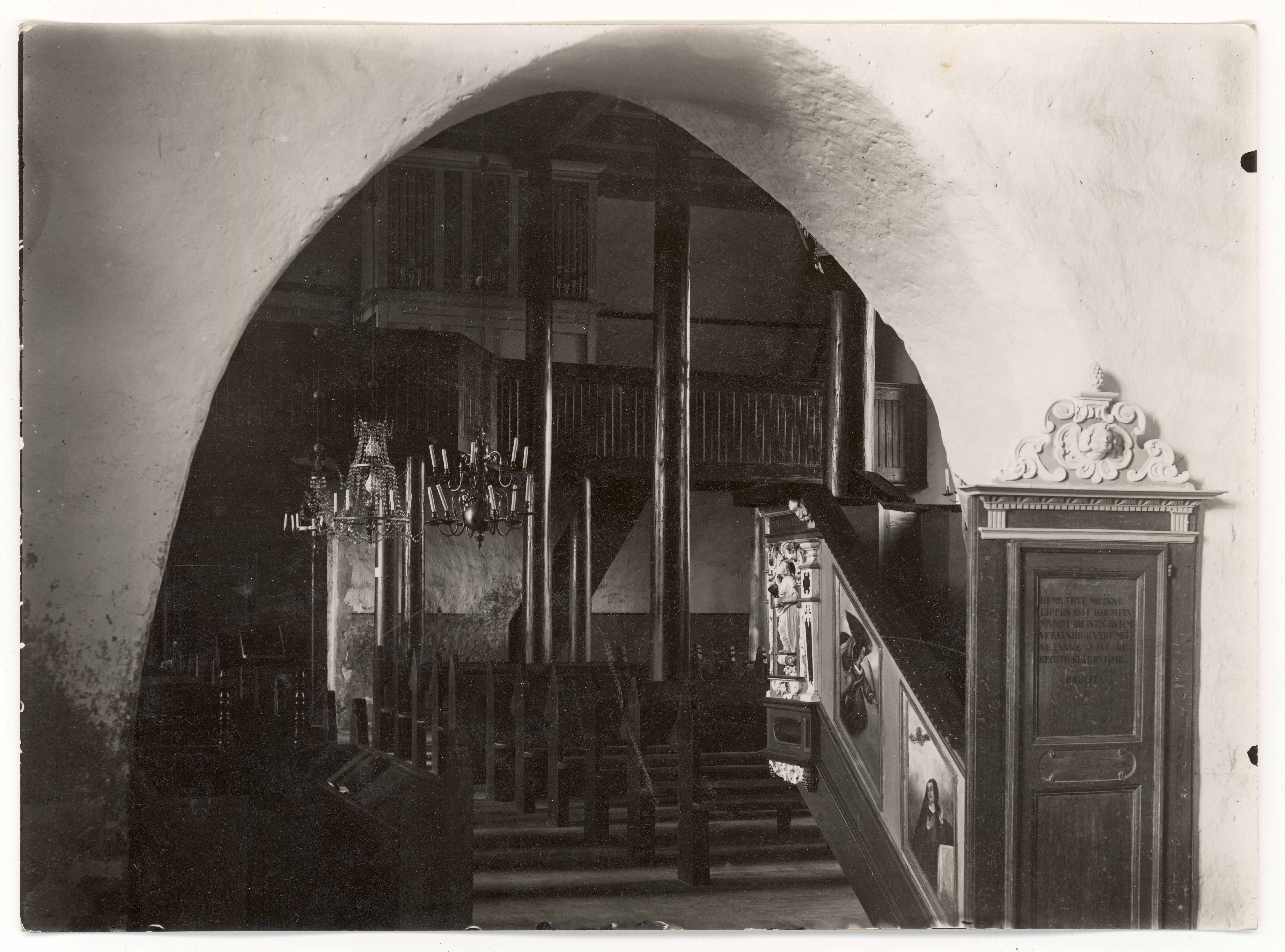 Tekst negatiivi ümbrikul: Vormsi kirik. Sisevaade koorist löövi. 212-14. Templid: Kabinett; Grünthal 1933