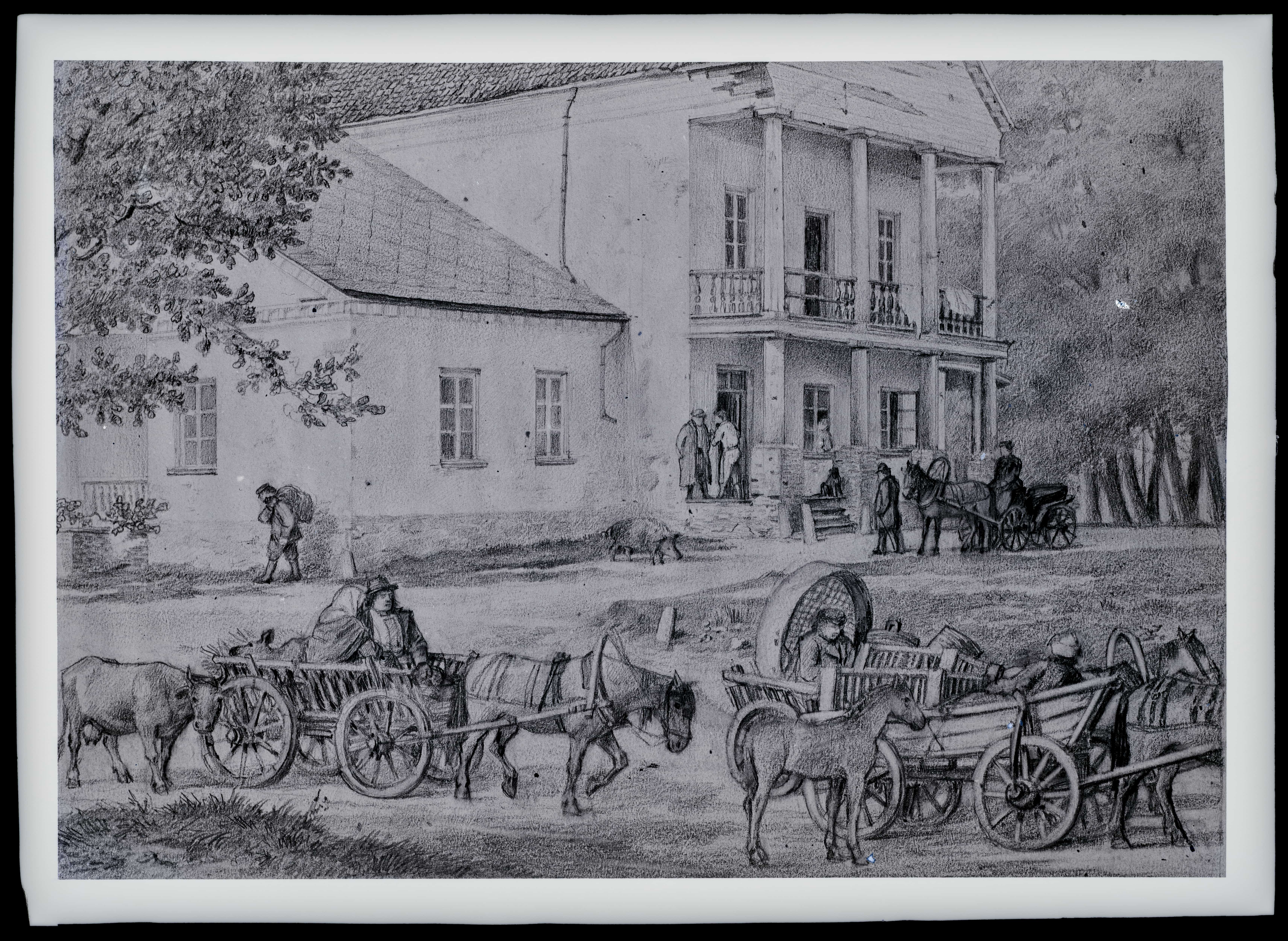 R. J. von zur Mühlen. Laadapäevalised vankritega mõisa juures (ERM)