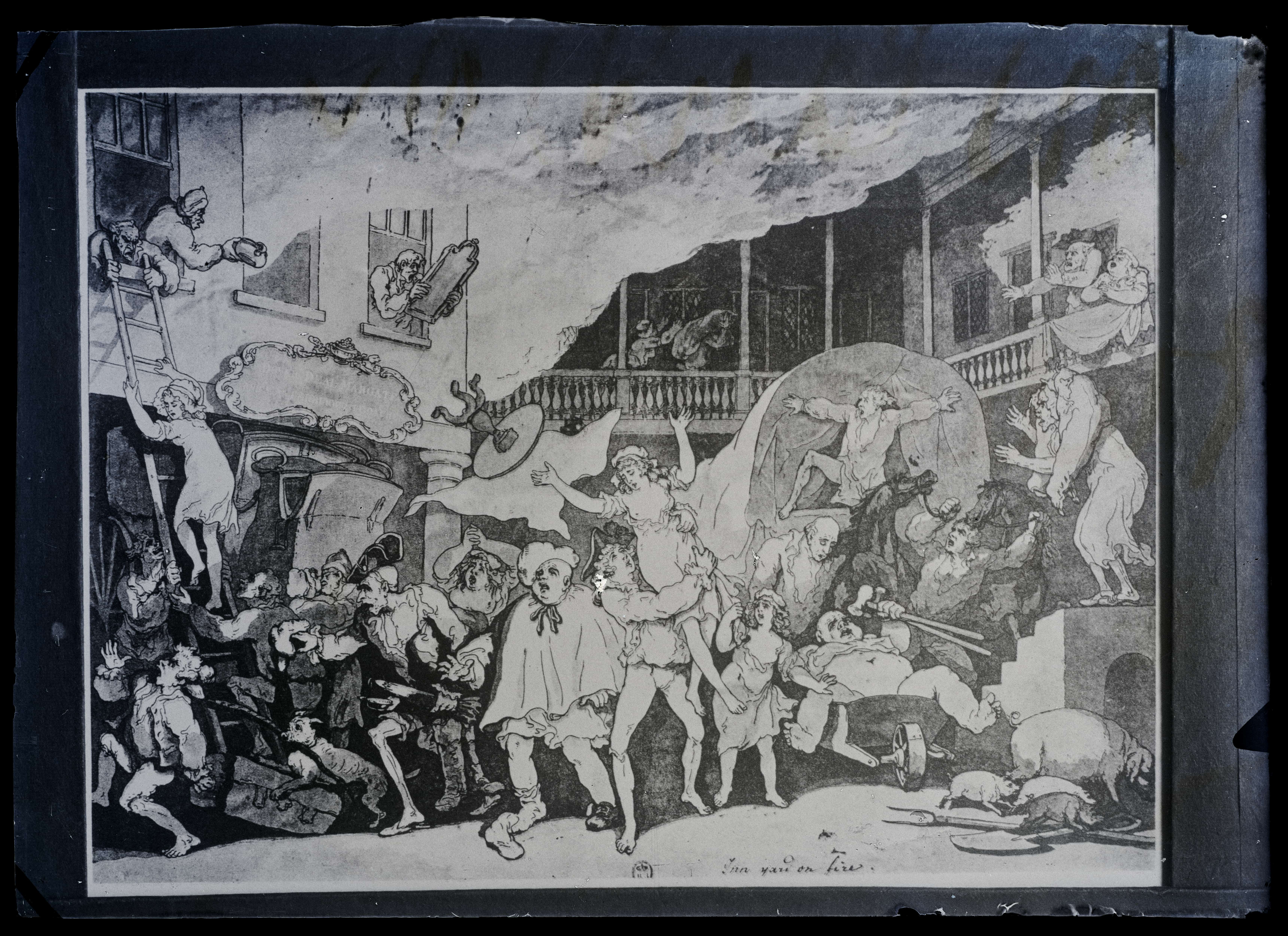 Tekst negatiivi ümbrikul: Rowlandson. Tulekahju võõrastemajas. Tempel: Selleke