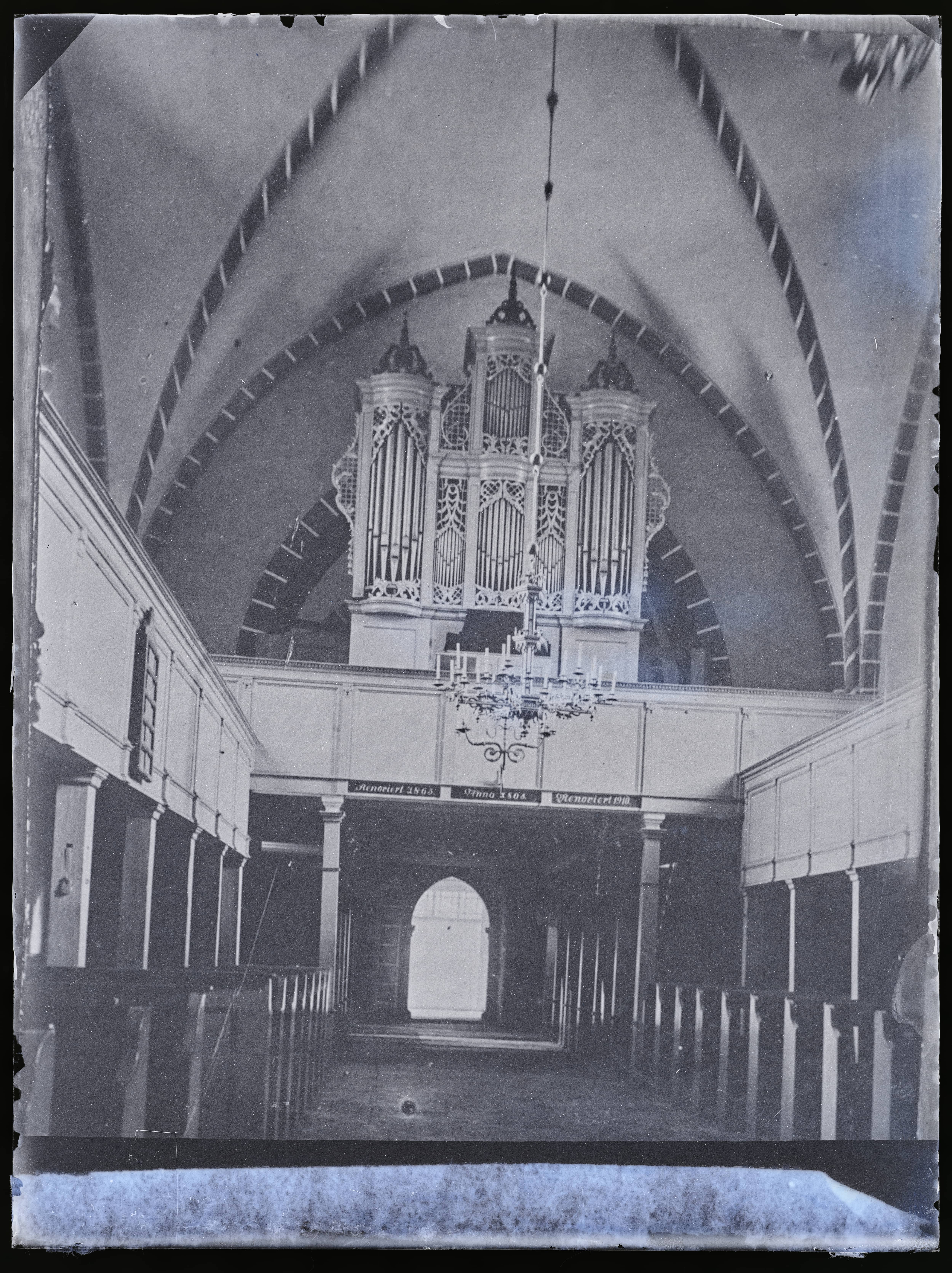 Tekst foto tagaküljel: Kihelkonna, Sisevaade lääne poole. Thomson, 1924. neg 9x12