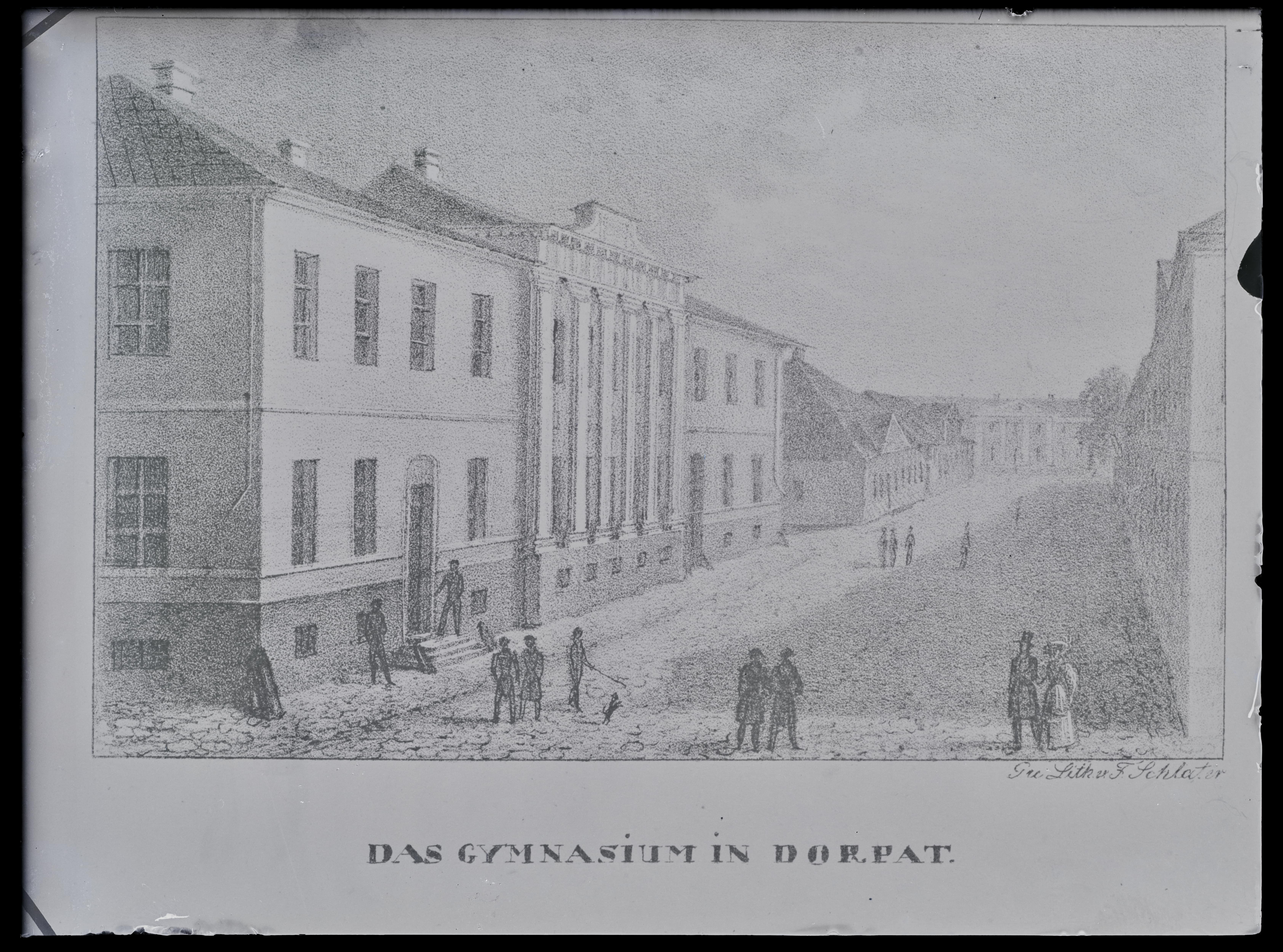 Tekst negatiivi ümbrikul: Schlater. Tartu gümnaasium. IV 1. Das Gymnasium in Dorpat. Vaade gümn-le Munga tn nurgalt. Sissekäik Gümn. Rüütli tn poolselt küljelt kujutatud. Ansichten von D 1834