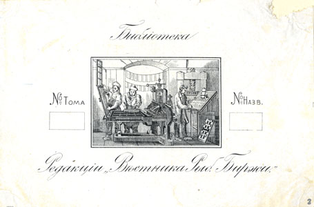 Keskel vaade trükikoja interjöörile kolme inimfiguuriga, ülal keskel tekst: Библiотека all: Редакцiй Вестника Рыб. Биржи. vasakul: № ТОМА paremal: № Назв