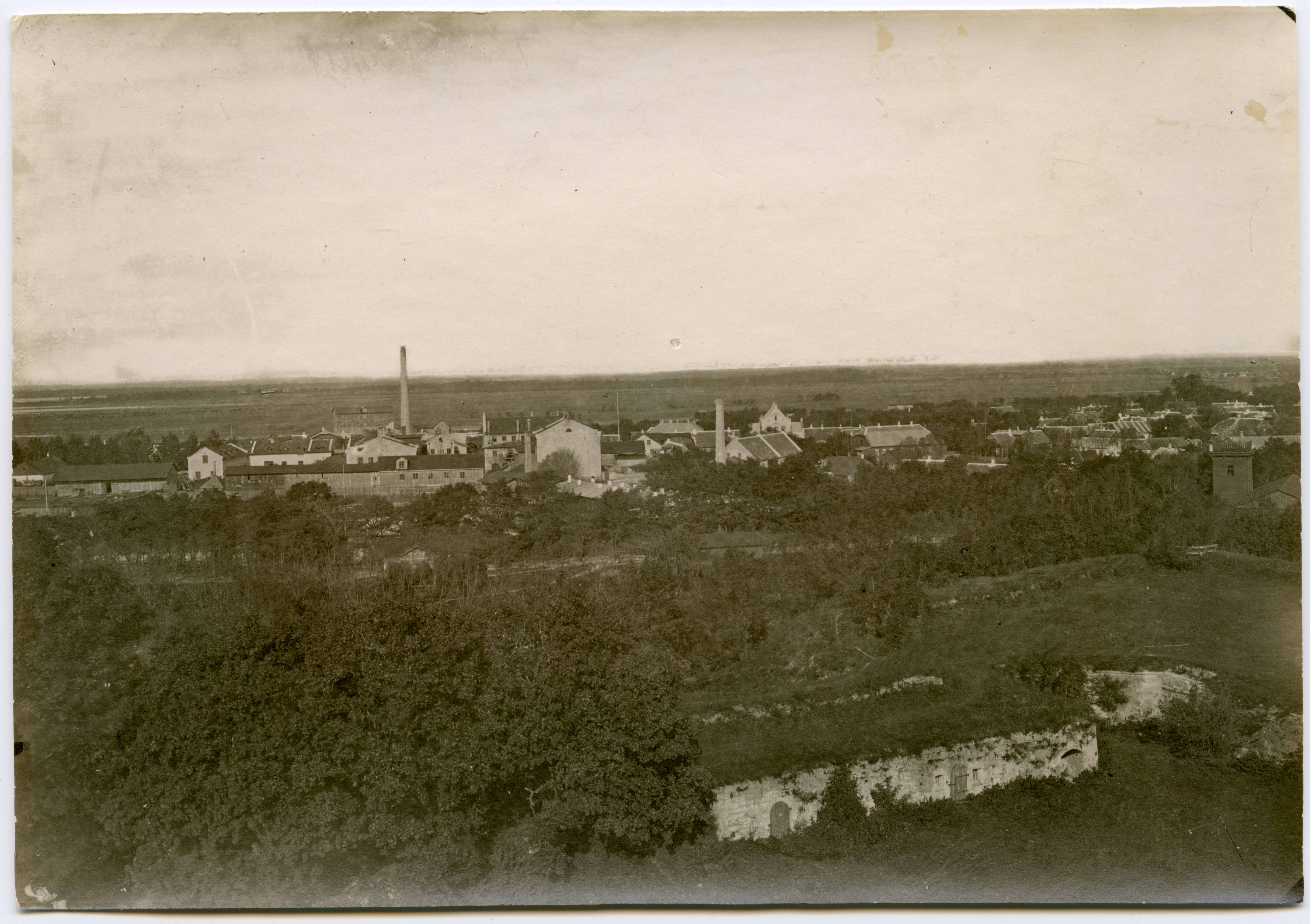 Kuressaare linnus. Panoraamvaade Wildenberg Lehderi vabrikule (St. Peterburgist) NW-kaitsetornist NW suunas