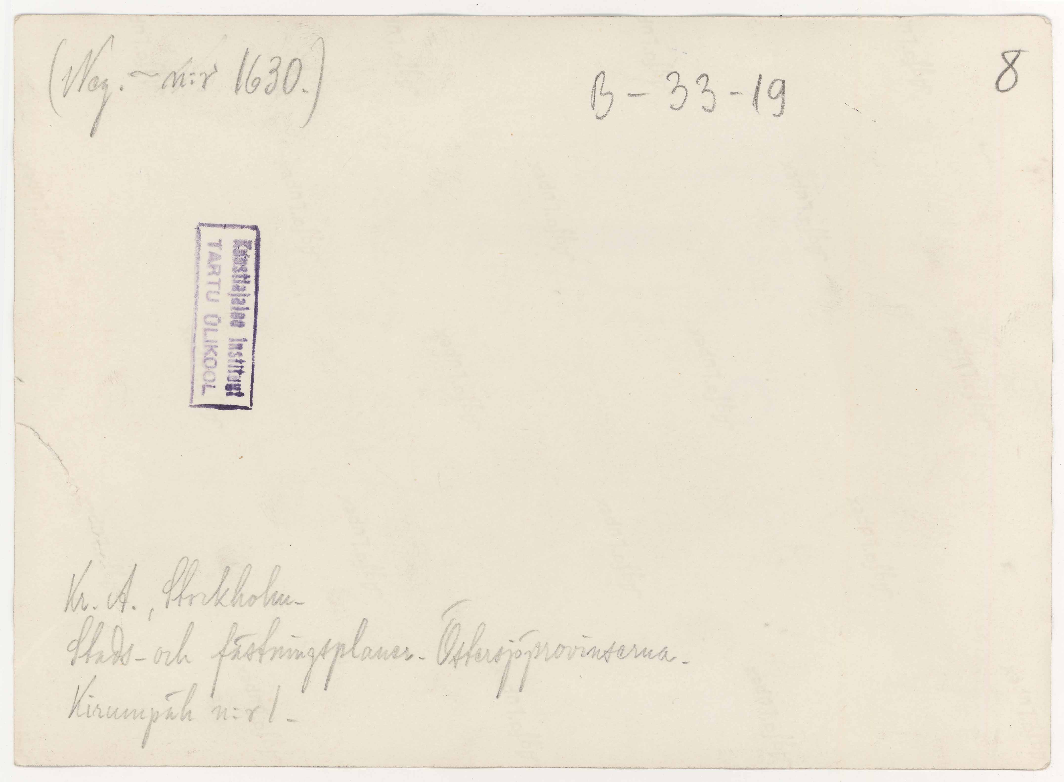 Tekst foto tagaküljel: (Neg.-n:r 1630). Kr. A. Stockholm. Stads- och fästingsplaner. Östersjöprovinterna. Kirumpäh n:r 1. Tempel: Instituut