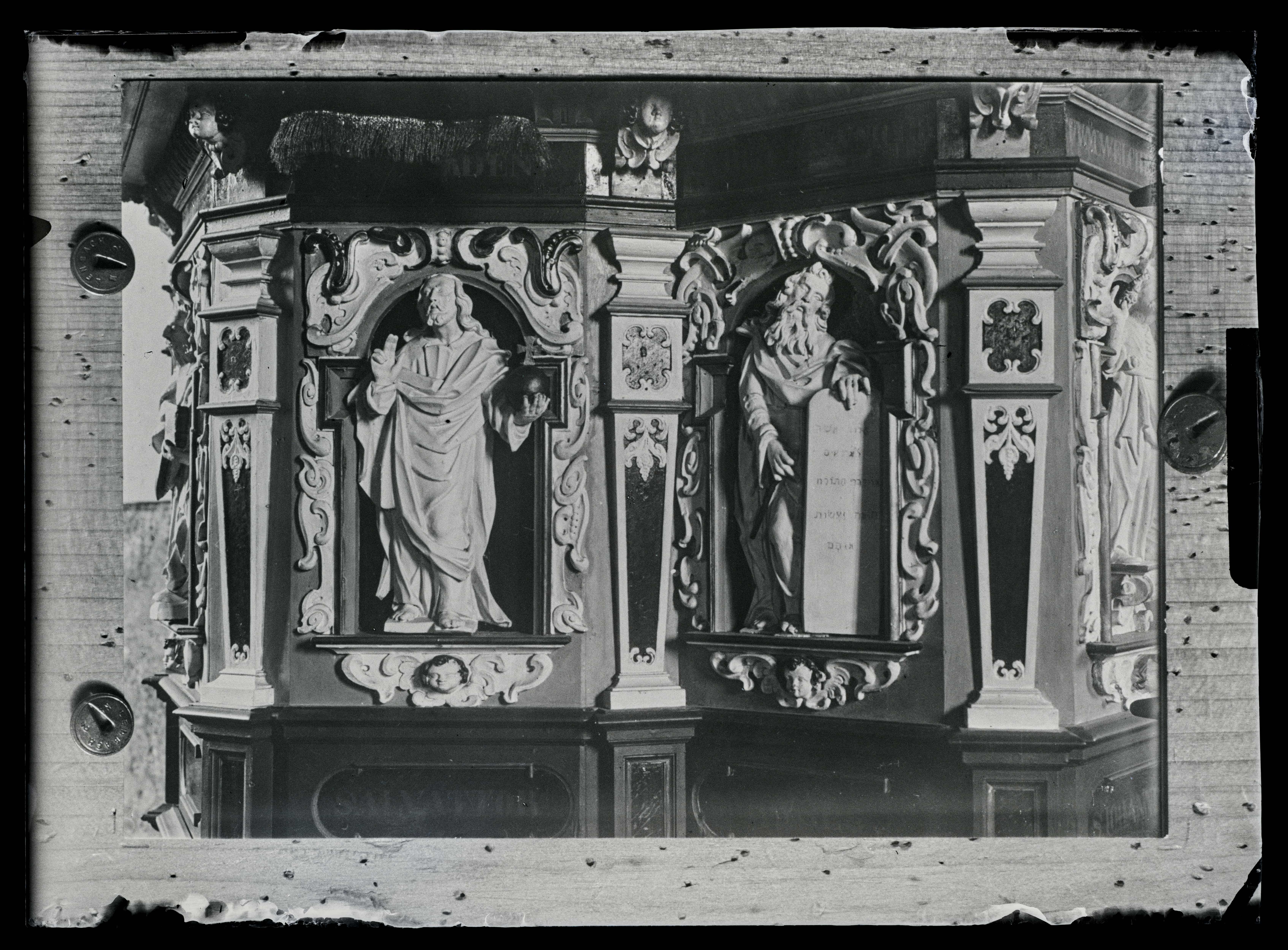 Vormsi Olevi kiriku kantsli detail. Kristus ja Mooses