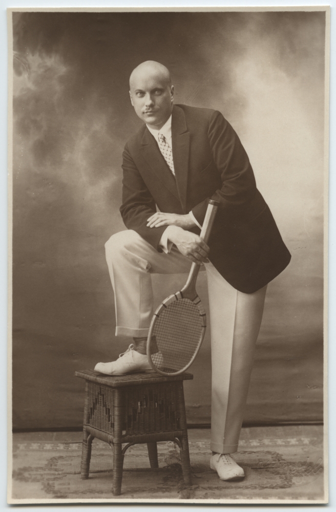 Normann, Herbert. Täisfiguurportree tennisereketiga, jalg toetumas taburetile