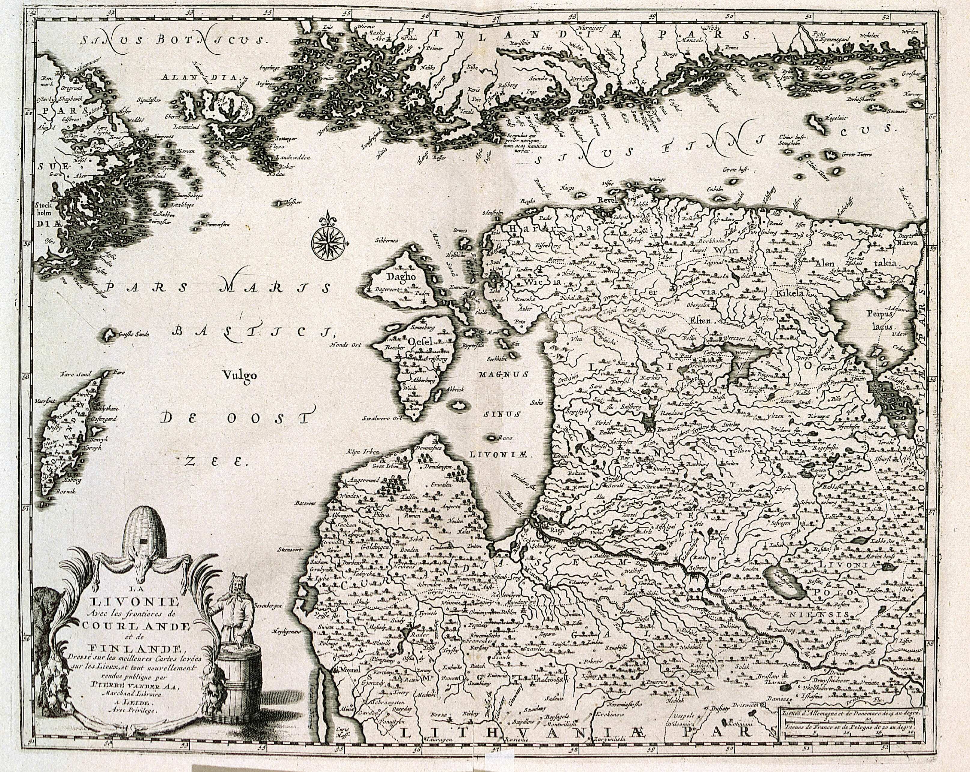 La Livonie avec les frontieres de Courlande et de Finlande / Dressé sur les meilleures Cartes levés sur les Lieux, et tout nouvellement rendue publique par Pierre van der Aa