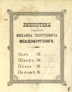 Nelinurkses ornamenteeritud raamistuses: БИБЛIОТЕКА / Герцога / МИХАИЛА ГЕОРГIЕВИЧА / МЕКЛЕНБУРГСКАГО. / Залъ № / Шкафъ № / Полка № / На полкѣ №