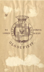 | dc.description | Sõõris vapp, sõõri kohal kroon. Plaadil keskel vasakul: EX / LIBRIS keskel paremal: COMITIS / ALEXII all: OLSOUFIEFF. ülal vasakul: № joonises: НИКТО КАКЪ БОГЪ | |