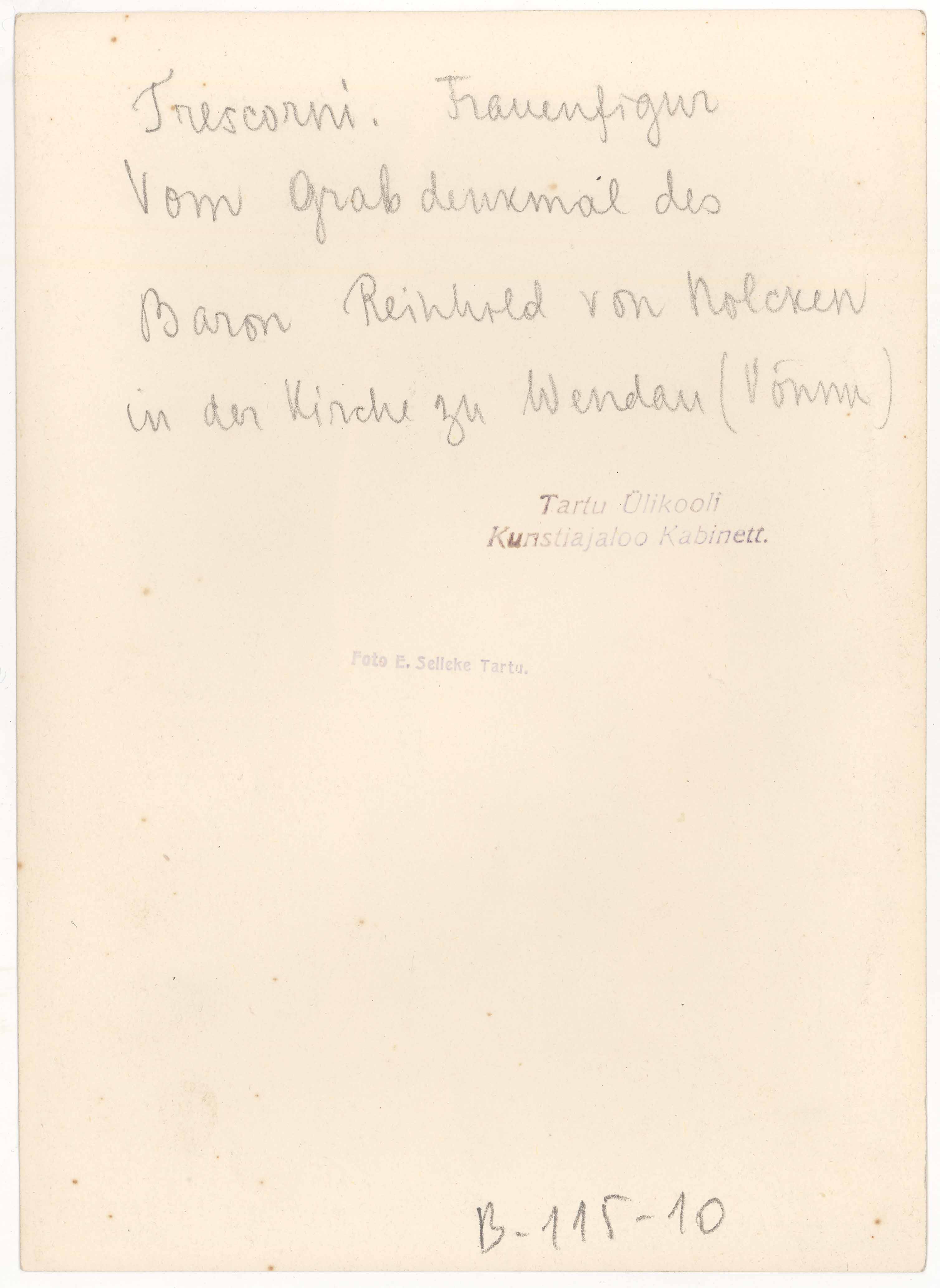 Tekst foto tagaküljel: Trescorni. Frauenfigur vom Grabdenkmal des Baron Reinhold von Nolcken in der Kirche zu Wenden (Võnnu). Templid: Kabinett; E. Selleke