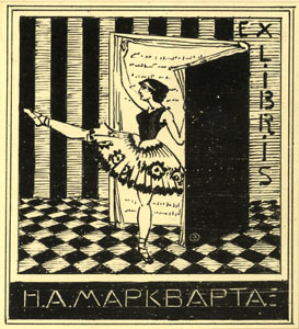 Ruudulisel ja triibulisel taustal avatud raamat baleriiniga. Joonises all keskel signeering all: Н.А. МАРКВАРТА. ülal paremal: EX / L / I / B / R / I / S;"Vt. TÜR KHO F 33
