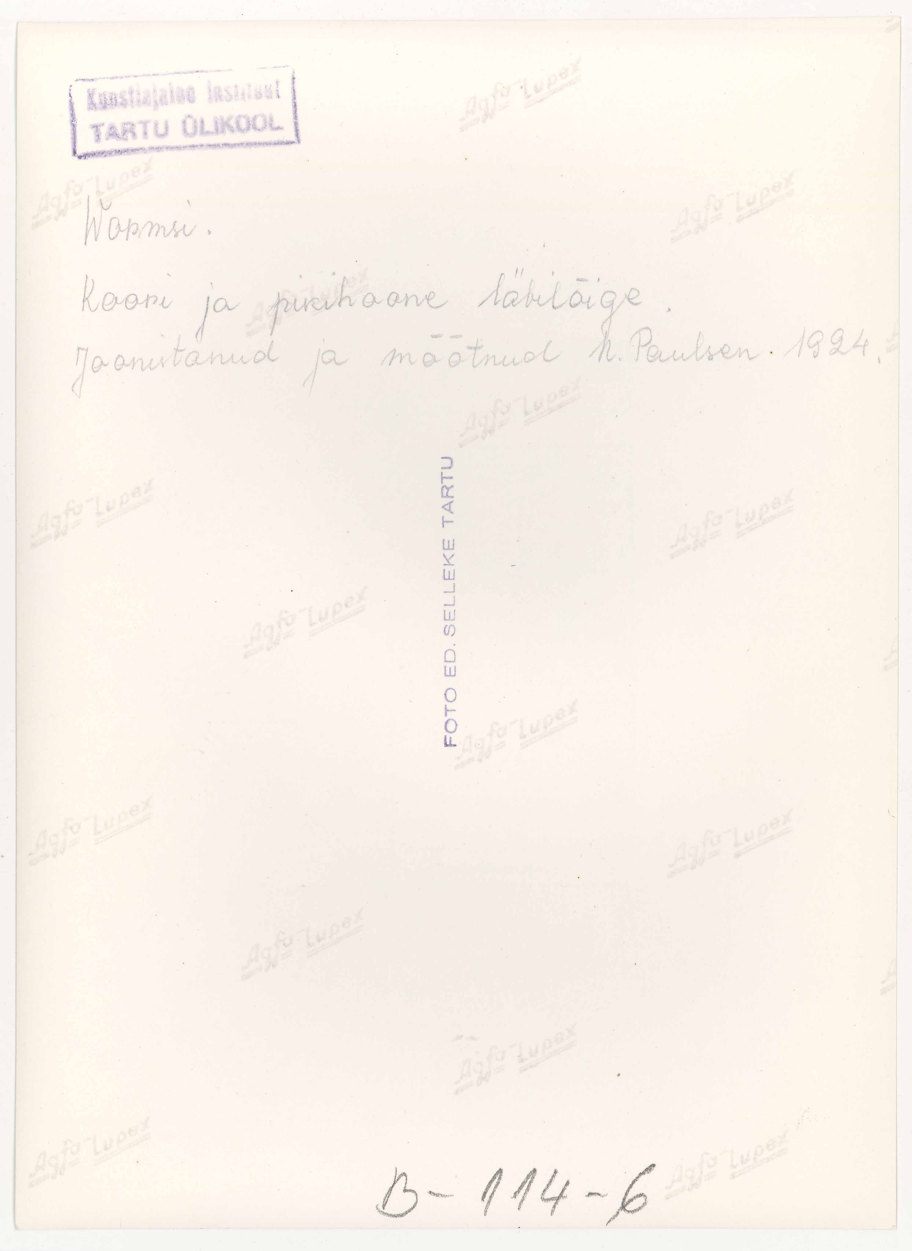 Tekst foto tagaküljel: Wormsi. Koori ja pikihoone läbilõige. Joonistanud ja mõõtnud N. Paulsen 1924. Templid: ED. SELLEKE; Instituut