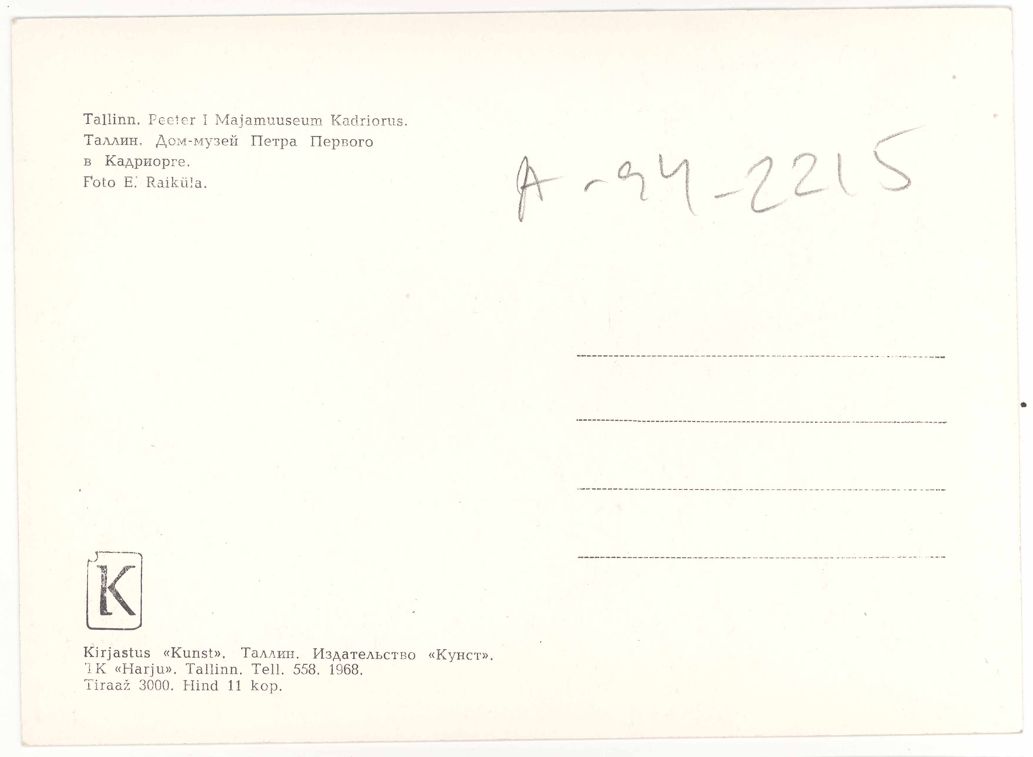 | dc.description | Tekst foto tagaküljel: Tallinn. Peeter I Majamuuseum Kadriorus. Foto E. Raiküla. 1968 | et |
