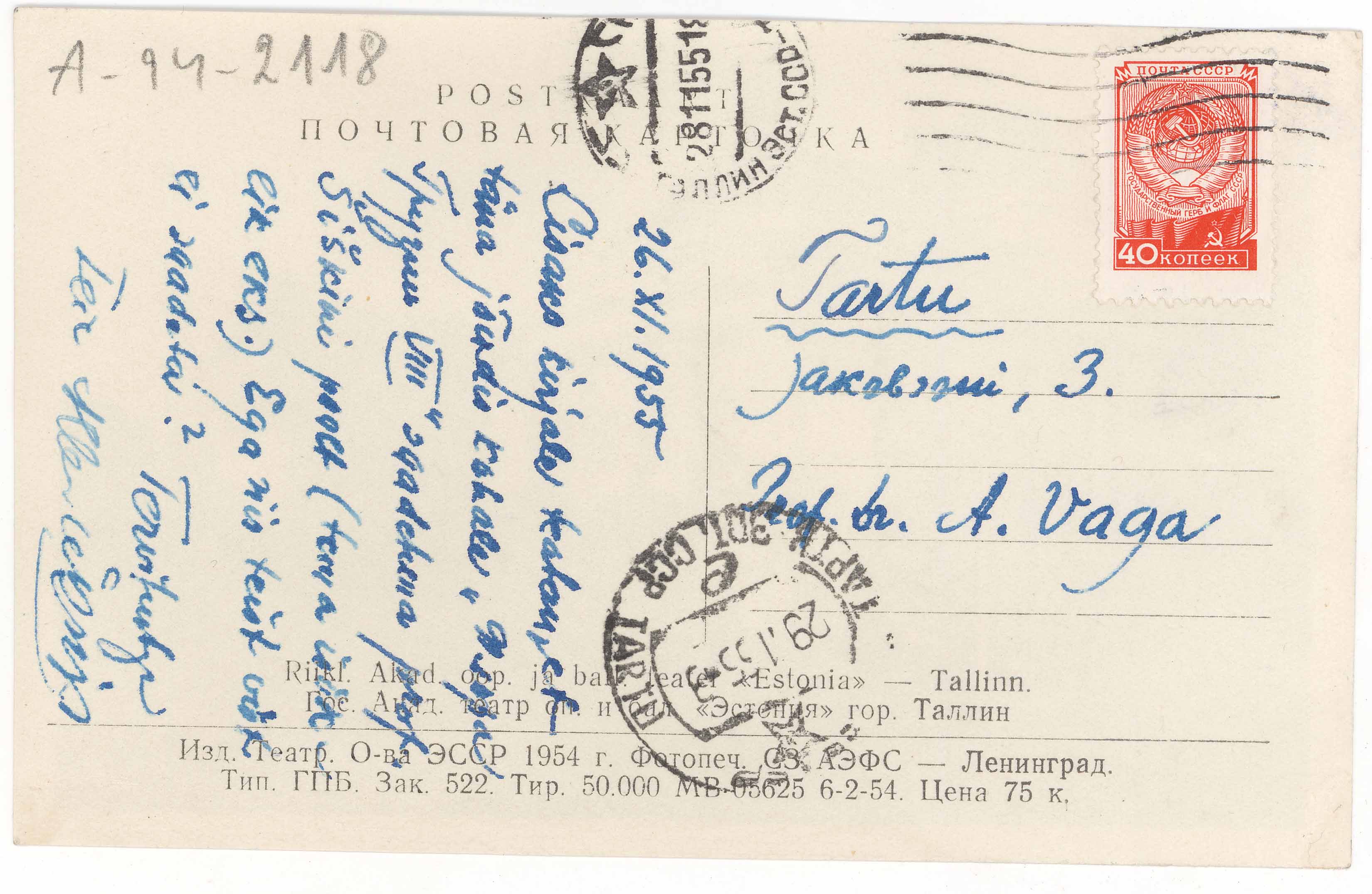 Tekst foto tagaküljel: Helmi Üpruse kiri V. Vagale 26.XI.1955. Kohale jõudnud 28.11.1955. Riikl. Akad. oop. ja ball. teater "Estonia". - Tallinn. 1954