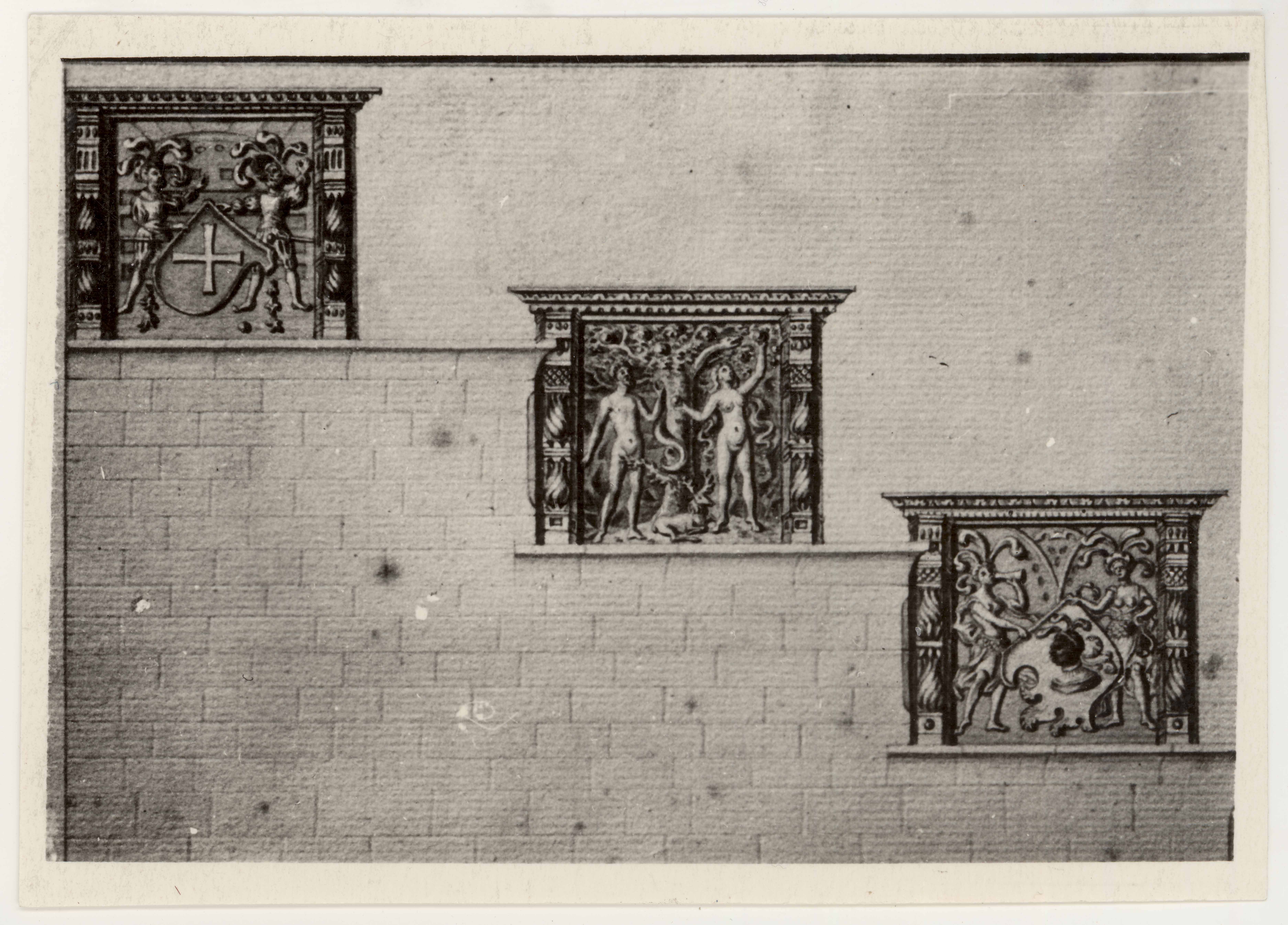 Tallinn. Astmetel asuvate reljeefide joonised. Vasakult: ristiga vapp; Aadam ja Eeva hea ja kurja tundmise puu juures; kaks narri riietes figuuri Mustpeade vapiga