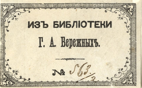 Nelinurkses ornamenteeritud raamis tekst: ИЗЪ БИБЛIОТЕКИ / Г. А. Бережныхъ. / №