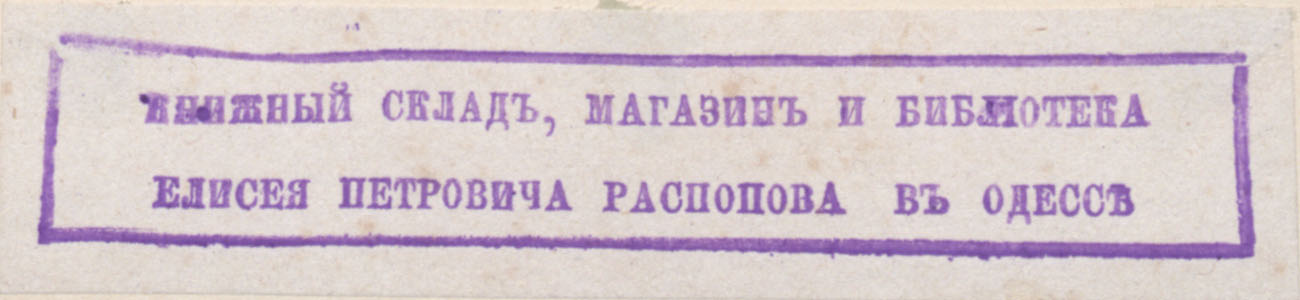 Nelinurkses raamistuses: КНИЖНЫЙ СКЛАДЪ, МАГАЗИНЪ И БИБЛIОТЕКА / ЕЛИСЕЯ ПЕТРОВИЧА РАСПОПОВА ВЪ ОДЕССѢ