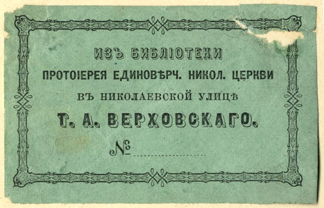 Nelinurkses raamornamendis: ИЗЪ БИБЛIОТЕКИ / ПРОТОIУРЕЯ ЕДИНОВѢРЧ. НИКОЛ. ЦЕРКВИ / ВЪ НИКОЛАЕВСКОЙ УЛИЦѢ / Т. А. ВЕРХОВСКАГО. / №