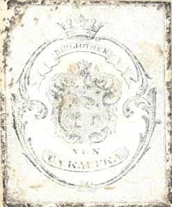 Nelinurkses raamistuses ornamenteeritud sõõr ja selles vapp, vapi kohal kroon, vapikilbil palett pintslitega, puu ja tundmatu ese. Joonises all keskel: VON C. v. KAFFKA ülal keskel: BIBLIOTHEK