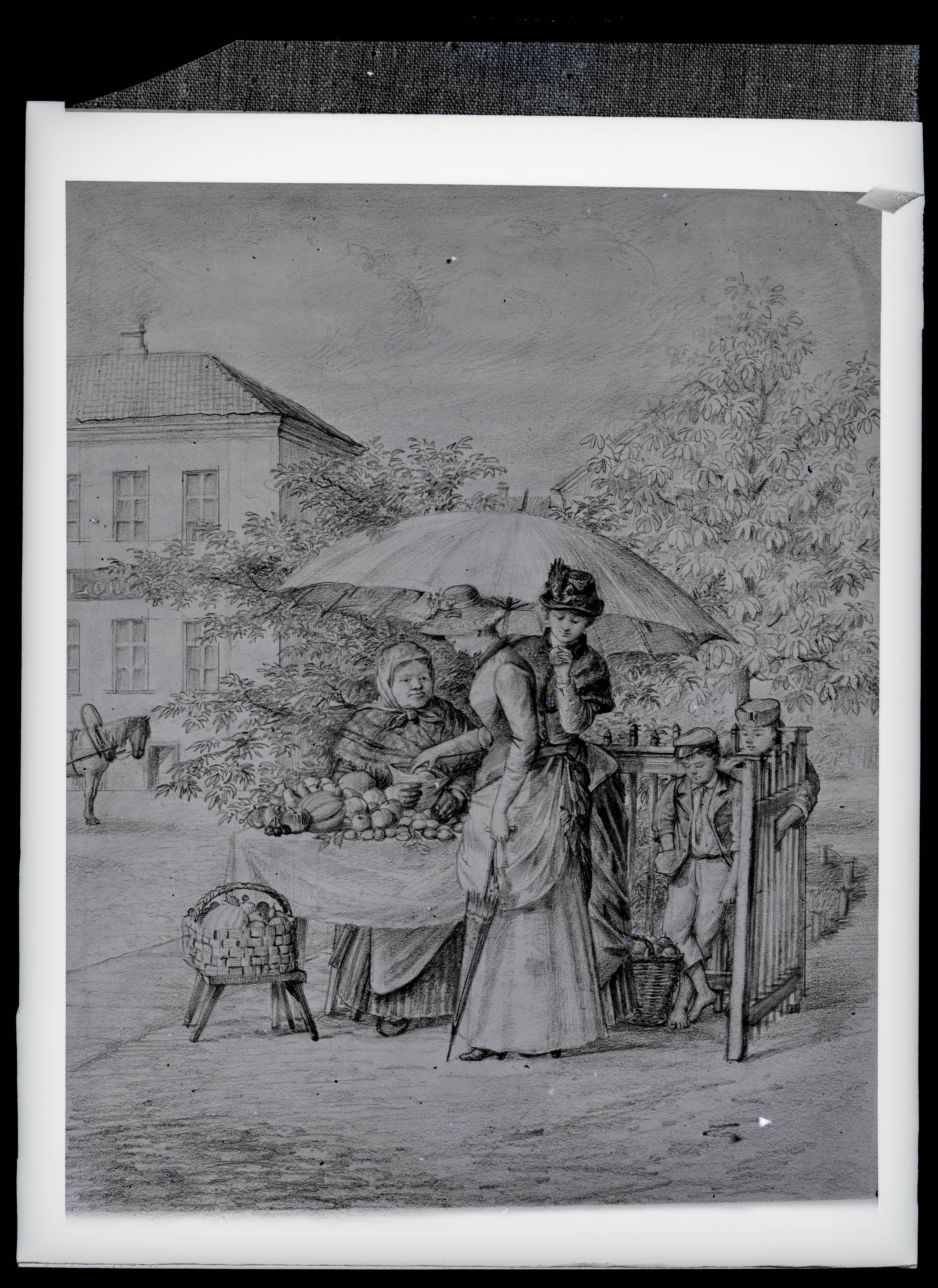 R. J. von zur Mühlen. Dorpater Skizzen. Päevavarjudega daamid sissoste tegemas (ERM)