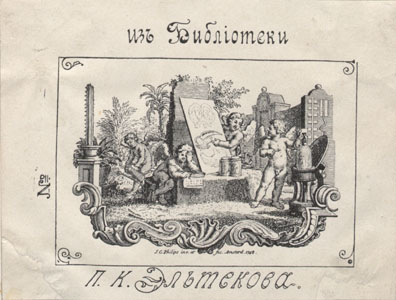 Nelinurkses raamistuses stseen nelja putoga. Joonises all: J.C. Philips inv. et fec. Amsterd. 1748. plaadil ülal: изъ Библiотеки all: П. К. ЭЛЬТЕКОВА. vasakul keskel: №;"Eksliibris on valmistatud J.C. Philipsi gravüüri (1748) järgi