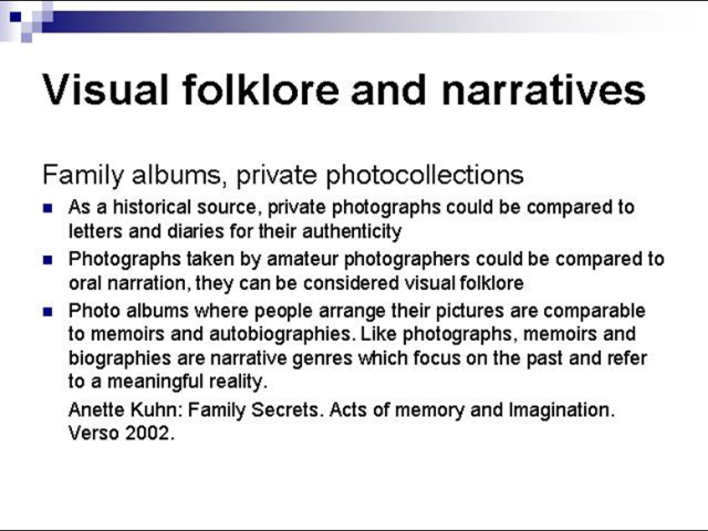 Loengus käsitletakse kultuuriuurimise metodoloogilist probleemi visuaalsuse ja narratiivsuse suhetest. Soome 1918. aasta kodusõja fotomaterjali põhjal analüüsitakse ametliku ja mitteametliku kujundiloome protsesse, sealhulgas amatöörfotograafiat kui visuaalset pärimust ning selle poolt edasikantavat teadmist ja tähendusi privaatsetes ja kultuurikontekstides ning sõjajärgses mälupoliitikas. Folkloristika ja etnoloogia vaatepunktist esitatakse küsimus, kuidas uurida kogemust ja pärimust fotomaterjali põhjal.