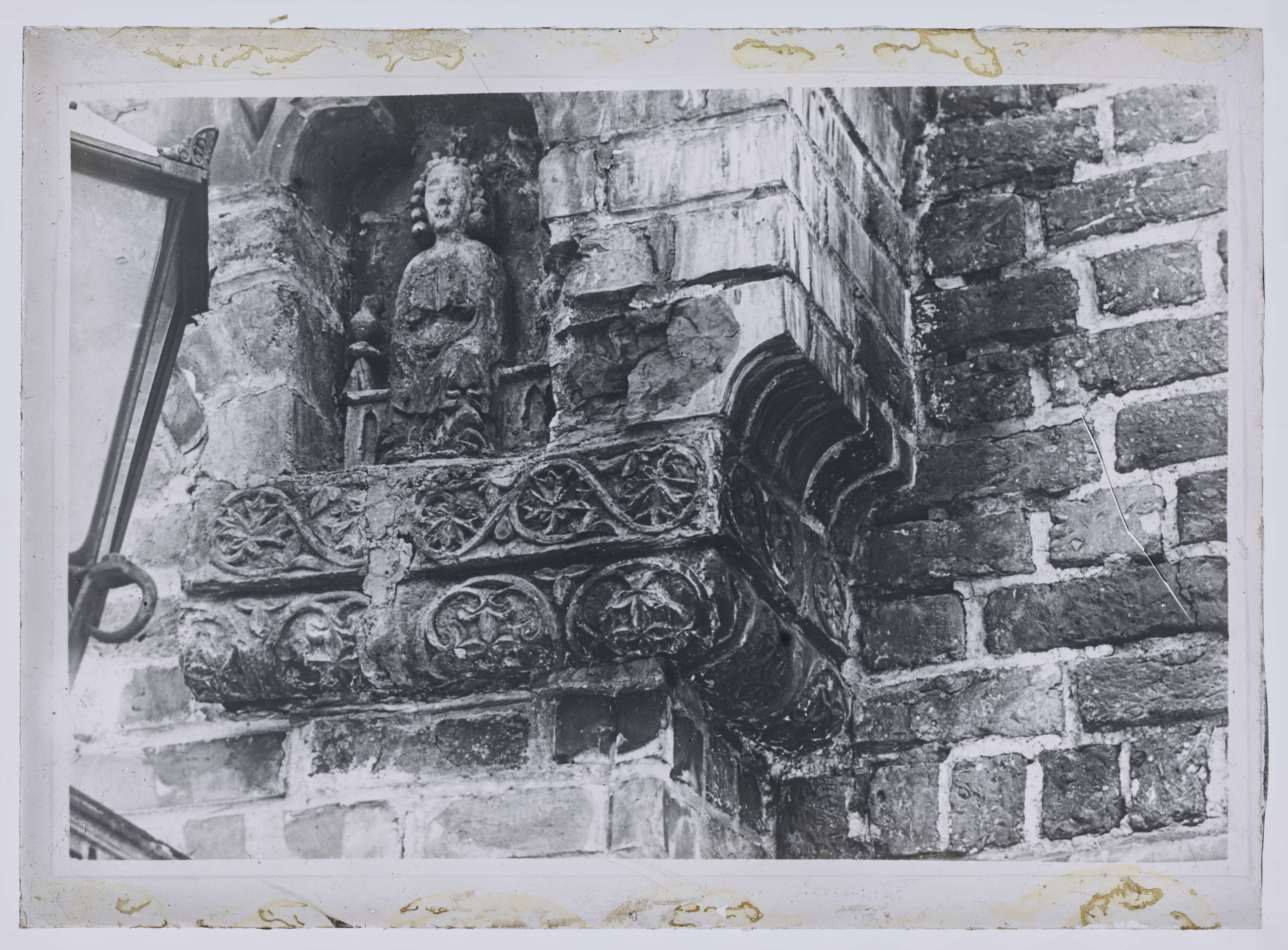 Tartu Jaani kirik. W-portaali vimpergi terrakotakapiteel ja üks terrakotakuju