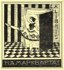 | dc.description | Ruudulisel ja triibulisel taustal avatud raamat baleriiniga. Joonises all keskel signeering all: Н.А. МАРКВАРТА. ülal paremal: EX / L / I / B / R / I / S;"Vt. TÜR KHO F 33 | |