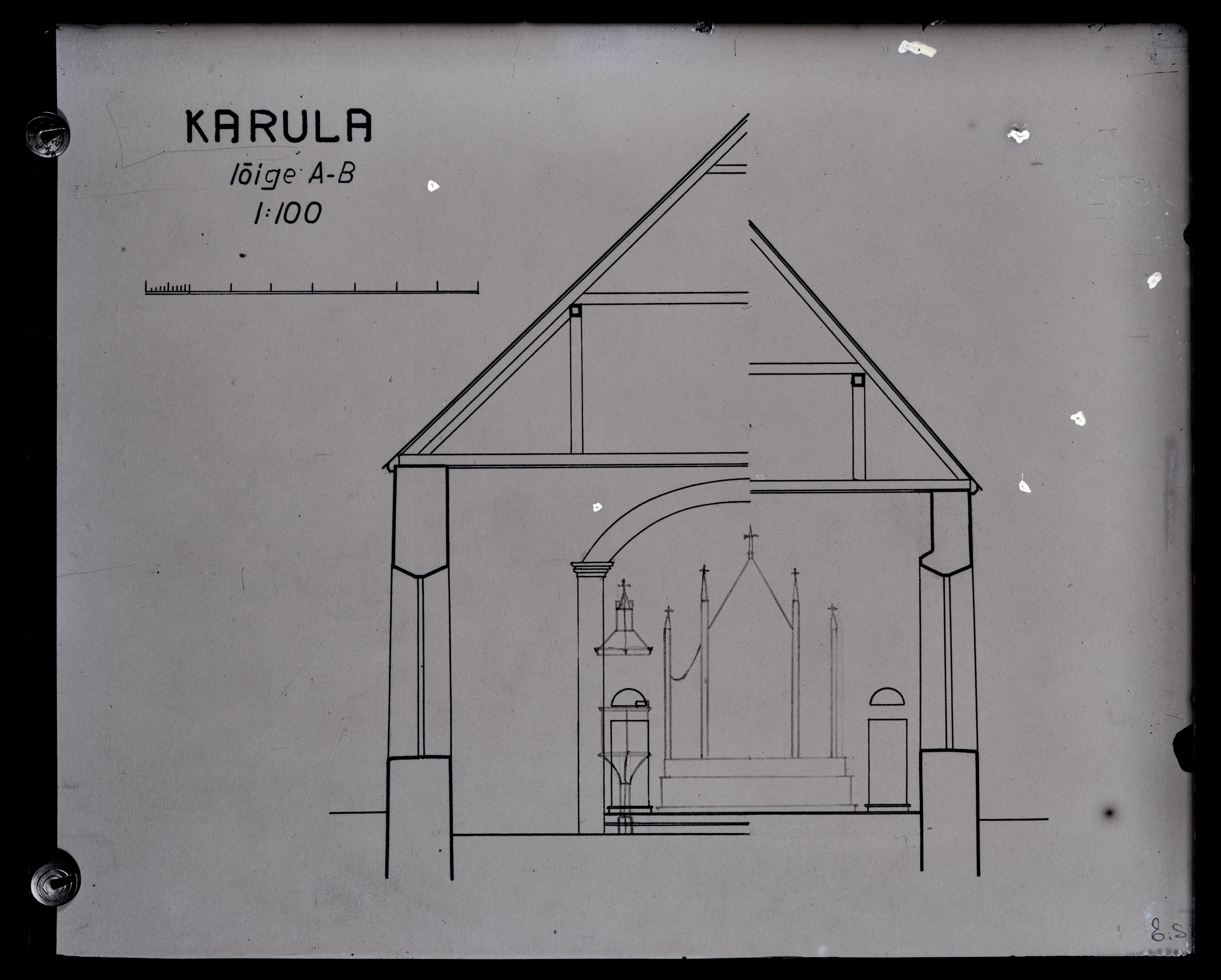 Karula Maarja kirik. Koori ja pikihoone ristlõige mõõtkavas 1:100. Koostanud E. Saadre