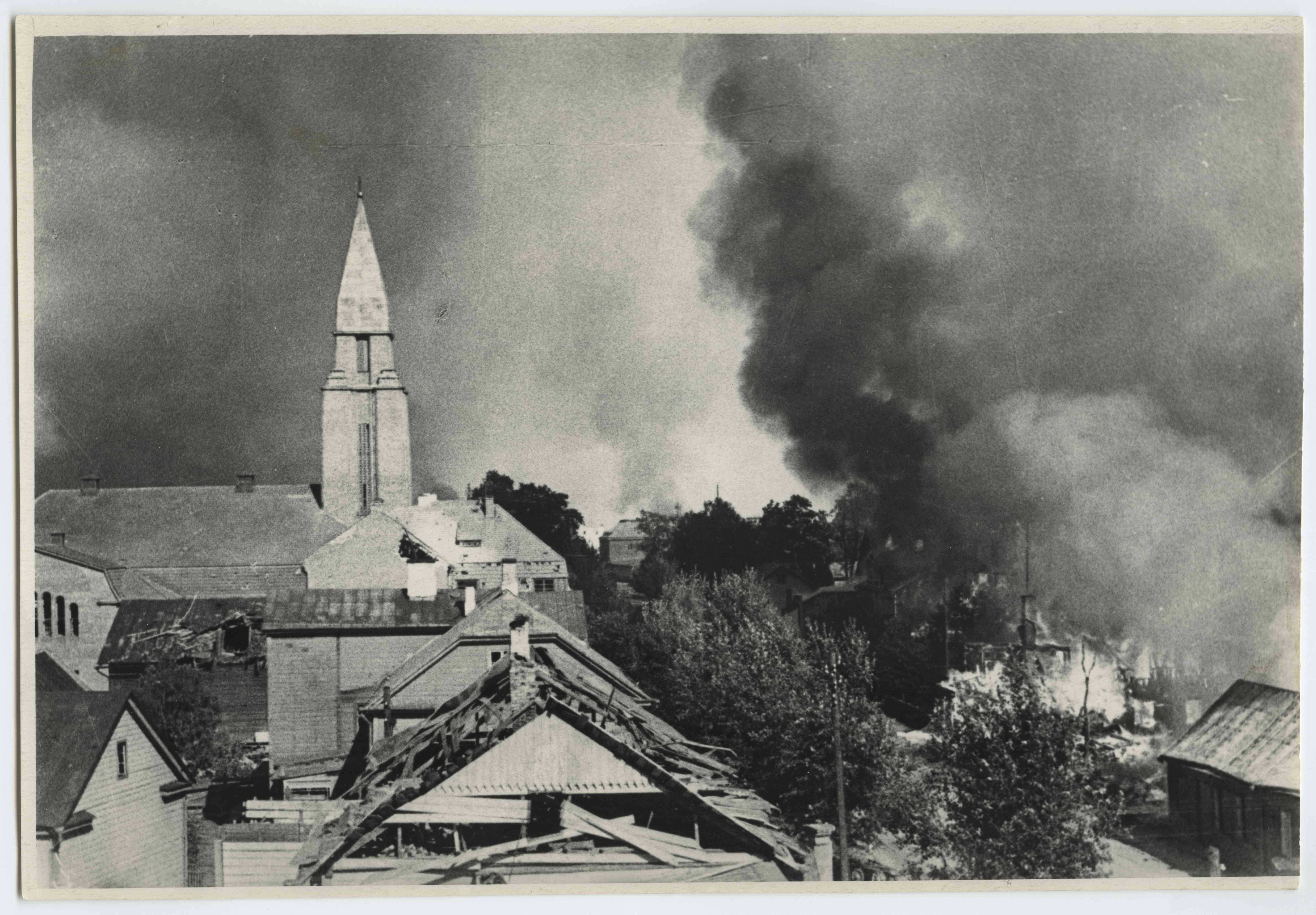 Tartu. Põlev linn 1944. aasta augustis lahingute ajal Riia tänava ja Pauluse kiriku piirkonnas