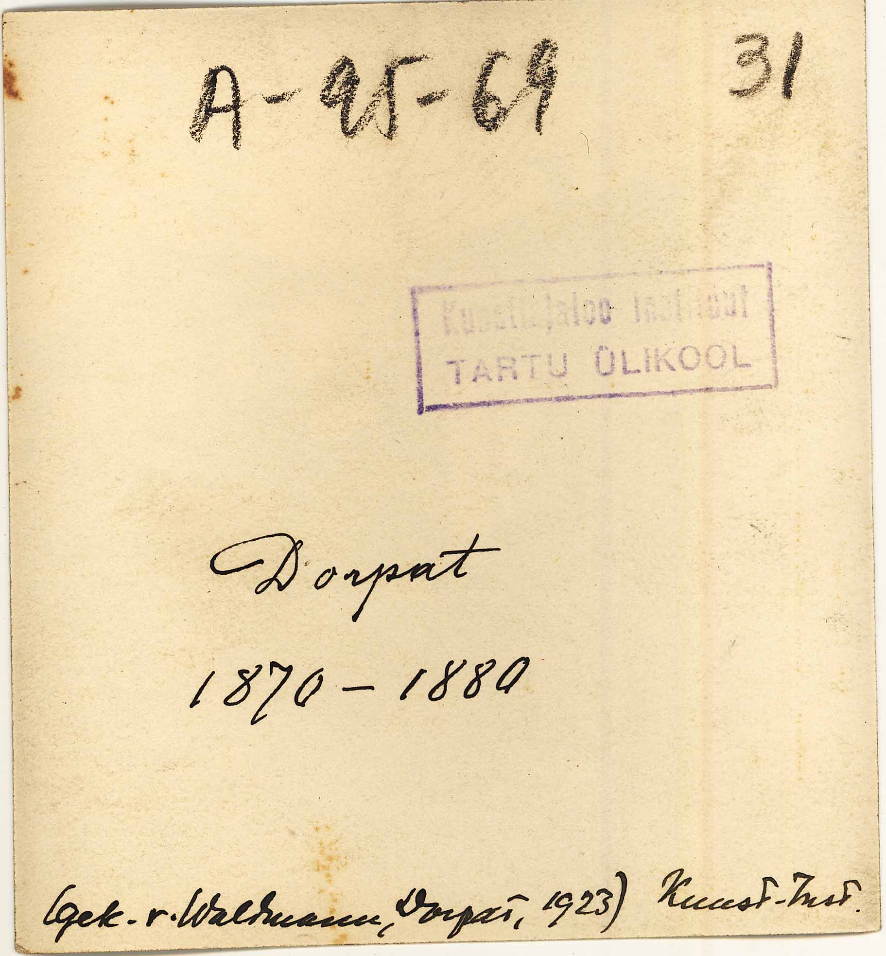 Tekst foto tagaküljel: Dorpat. 1870-1880. (gek v Waldmann, Dorpat, 1923) Kunst. Inst. Tempel: Instituut