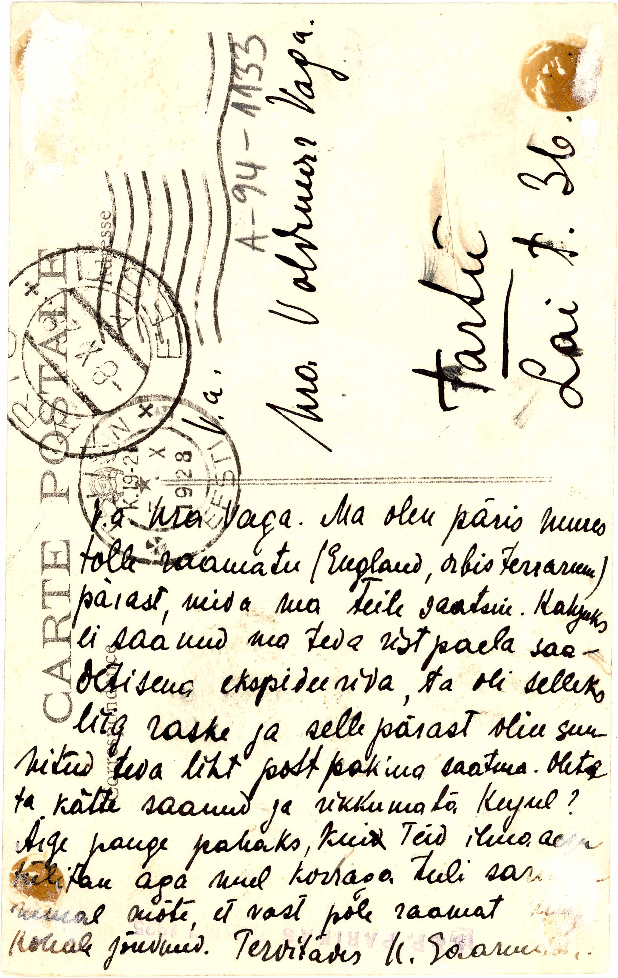 Tekst foto tagaküljel: H. Saarmanni kiri V. Vagale 8. X 1928. Tempel: Parikas, 1925