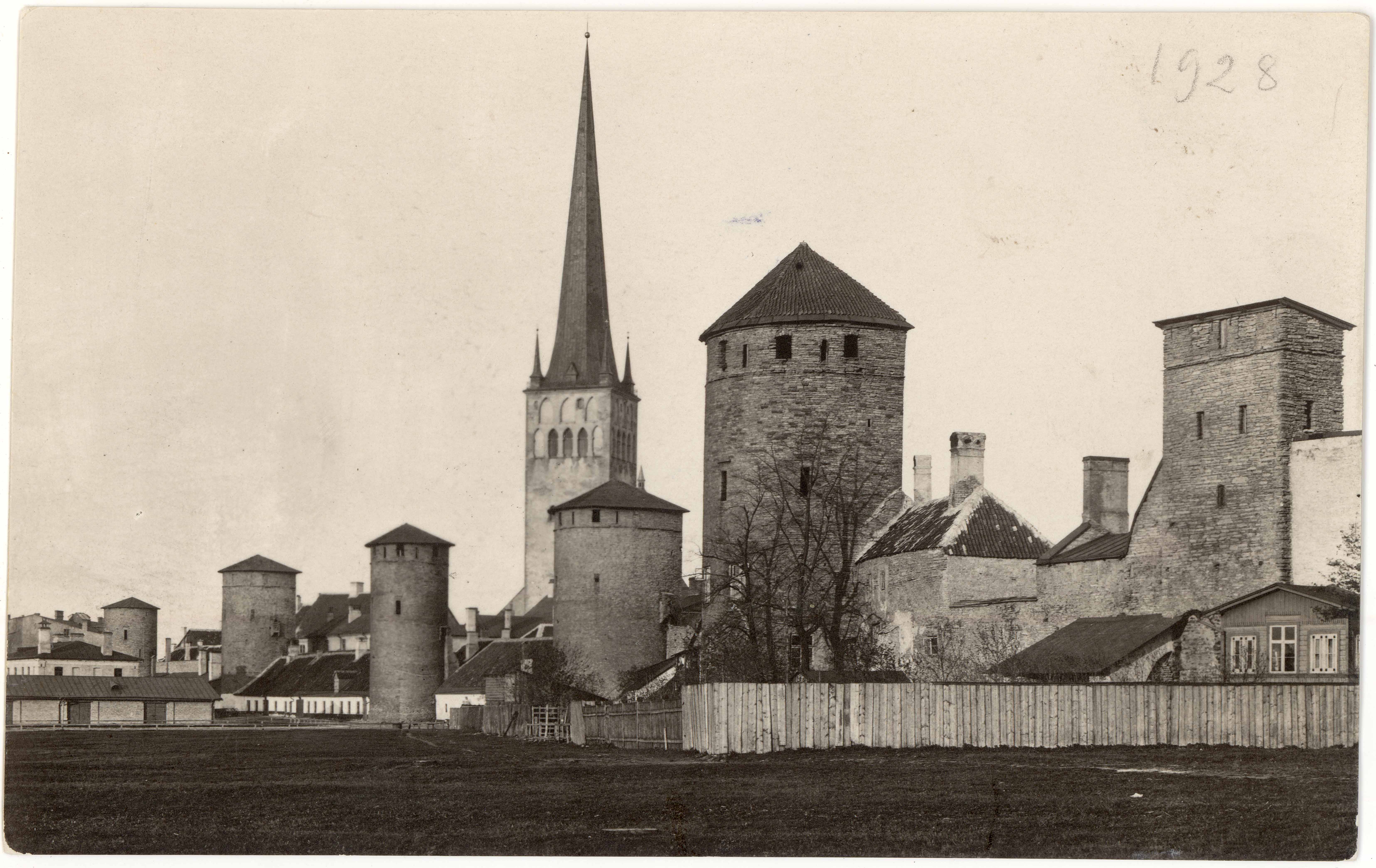Tallinn. All-linn. Laboratooriumi tänava äärsed tornid Tornide väljakult. Vaade W-st. Paremalt: Nunnadetagune, Loewenschede, Köismäe, Oleviste kiriku, Plate, Eppingi ja Grusbeke tagune torn.