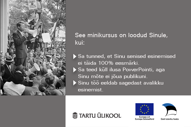 | dc.description | Sisu: Efektiivne ettevalmistus Sissejuhatus Millest alustada? Materjali organiseerimine Milline on hea kokkuvõte? Kuidas koostada sissejuhatust? Kuidas sisu liigendada? Tee oma sõnum mõjuvaks Keelelised võtted tähelepanu köitmiseks Kuidas numbreid köitvaks teha ? 5 asja, mida sa oma esinemises kunagi öelda ei tohiks Oma loo jutustamine Näitlikustavad abivahendid ja nende ette valmistamine, mida kasutada? Ideaalne slaidiesitlus Viimased sammud särava esitluseni Lihtsaid võtteid parema tulemuse saavutamiseks Teksti valdamine – kas õppida pähe? Hääl. Kuidas teha enneast kuuldavaks? Intonatsion, artikulatsioon. Selge kõne. Kehakeel Kuidas saada esinemishirmust üle? Esinemiseks häälestamine | et |