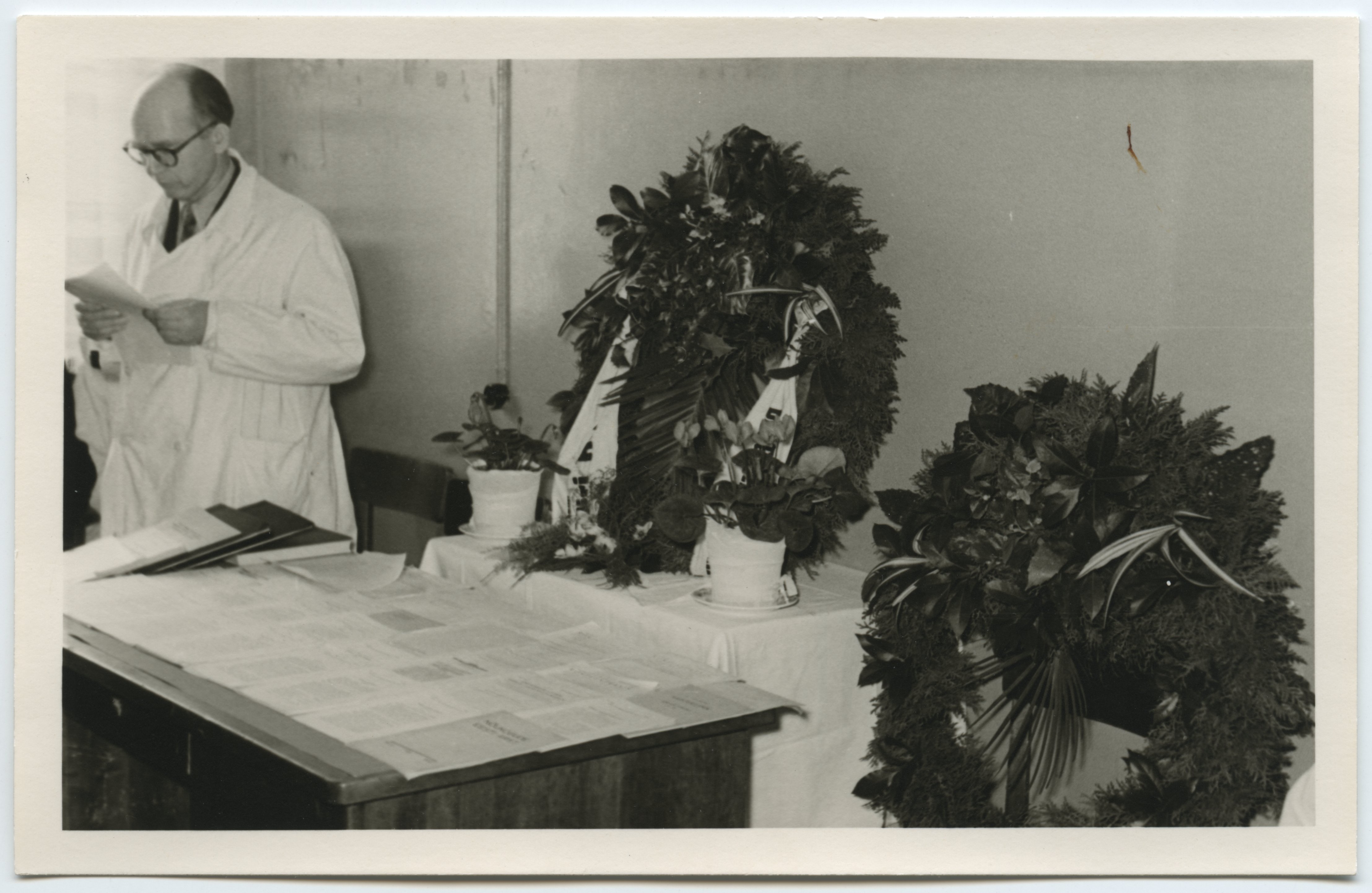 | dc.description | [Onkoloogiadispanseris?]. 17. Pärjad ja Jüri Haldre tööde näitus, seinal Jüri Haldre portree; 18.-19. Näituse juures kõnelevad Jüri Haldre kolleegid | |