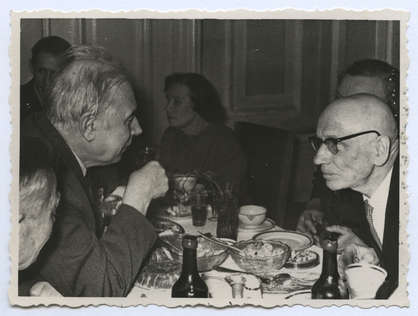 Valmar Adams (vasakul) ja Aleksander Elango peolauas vestlemas